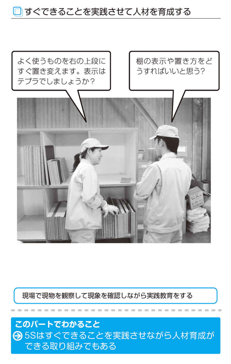 5Sは見える化したり置き方を決めたりする活動であり、その見える化した状態と実態や置き方を観察して、「できていない」ことに気づかせます。つまり5Sは、活動を実践しながら気づく人材を育成する活動ともいえるのです。