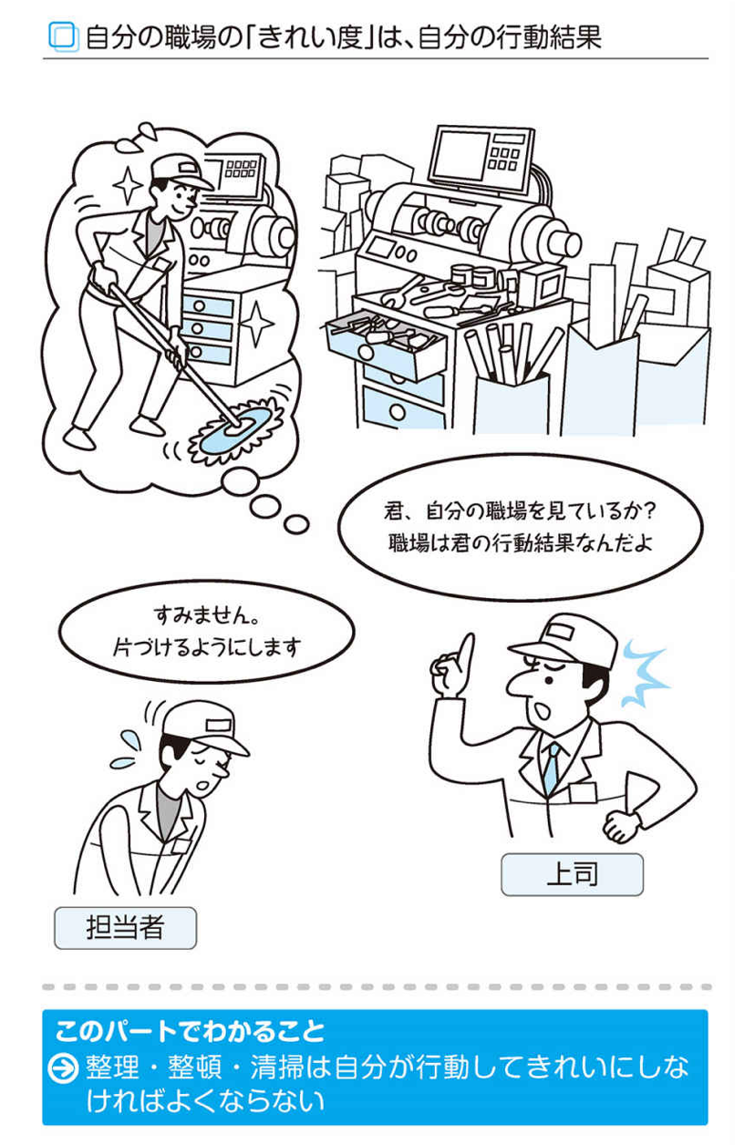 「自分の職場は自分が整理・整頓・清掃しなければ誰もやらない」ことを自覚するとともに、「自分の職場の整理・整頓・清掃は自分の仕事」であると、自分の役割を再認識することです。