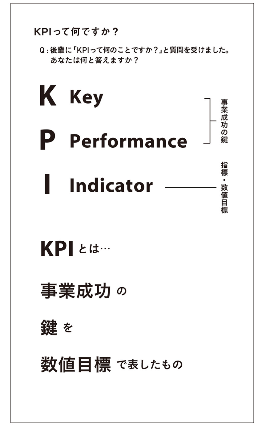 KPIとは、「事業成功」の「鍵」を「数値目標」で表したもの。簡単ですね。そして、この単純で簡単な一文にKPIのすべてが詰まっているのです。