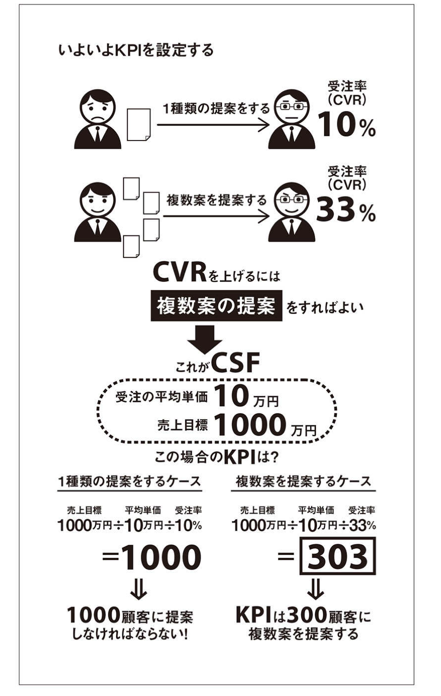 この「複数案の提案」こそがCSFです。受注の平均単価が10万円で、売上目標が1000万円の場合のKPIを計算してみます。