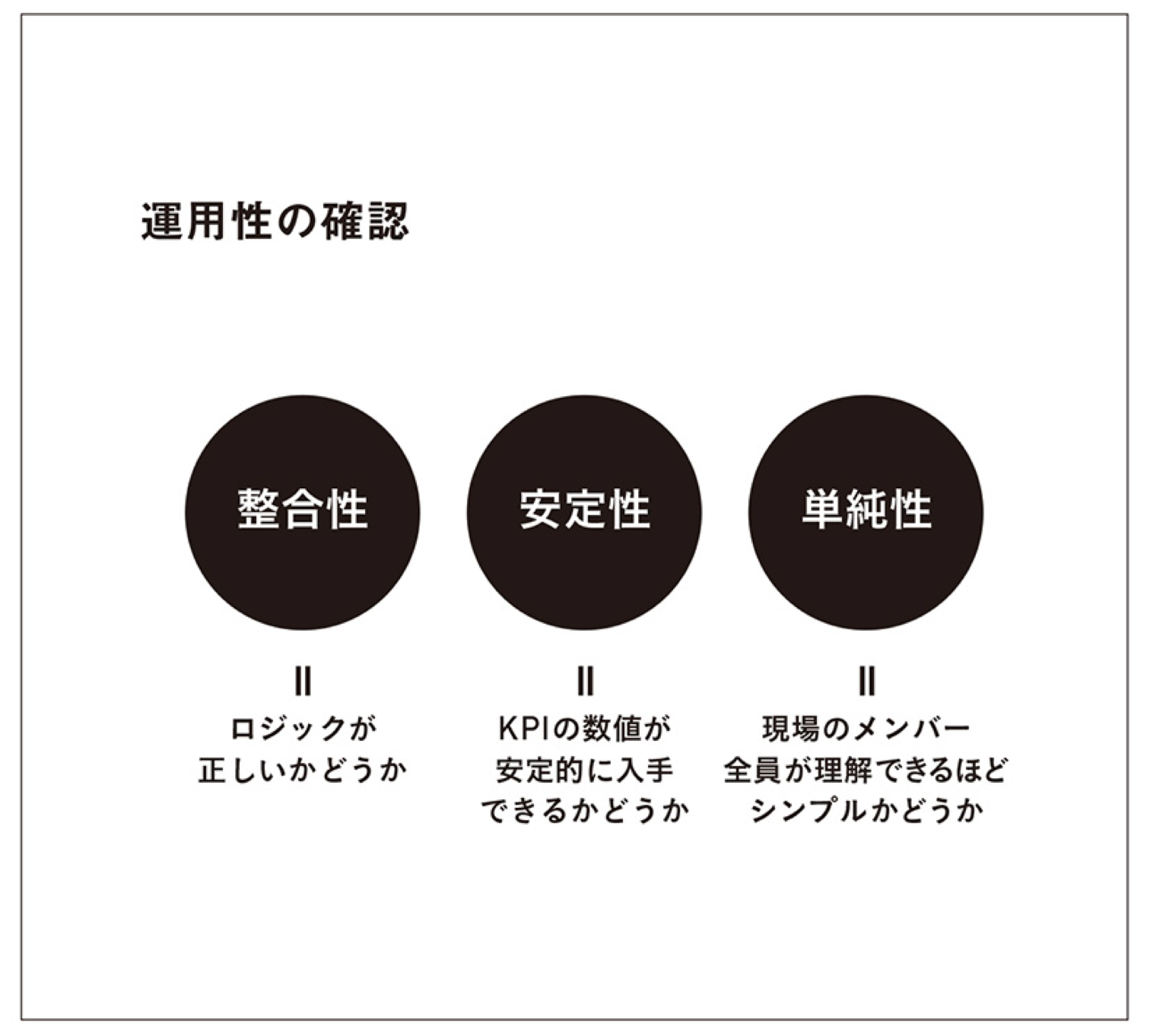 つまり、設定したCSFやKPIの理屈上の正しさと、実際に運用できるのかを事前に確認しておくのです。ポイントは3つ。
