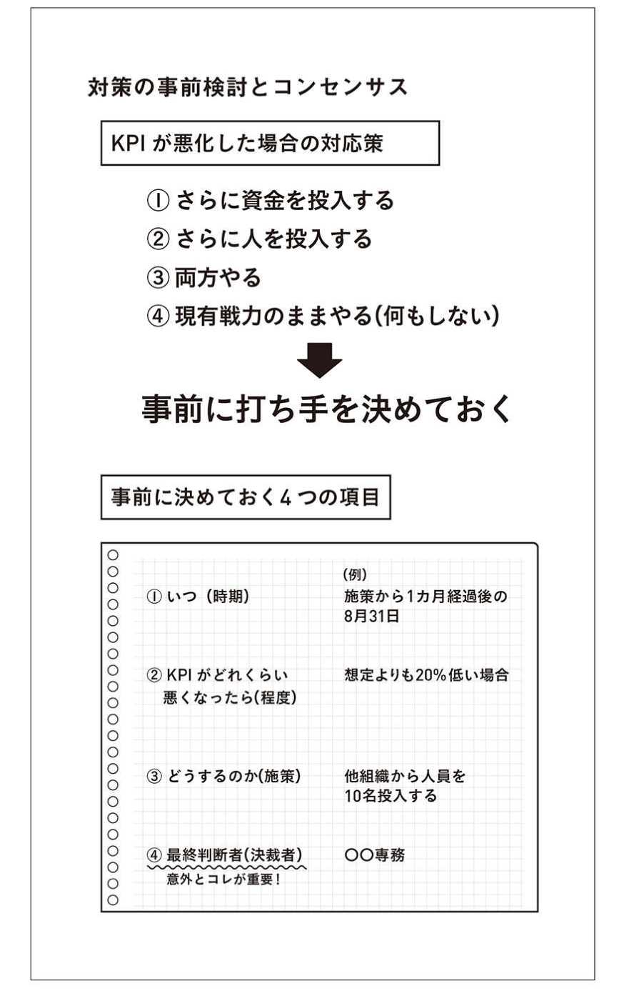 このケースでいうと、1カ月経過後(時期)、KPIが想定よりも20%低い場合(程度)、他組織から人員を10名投入する(施策)。