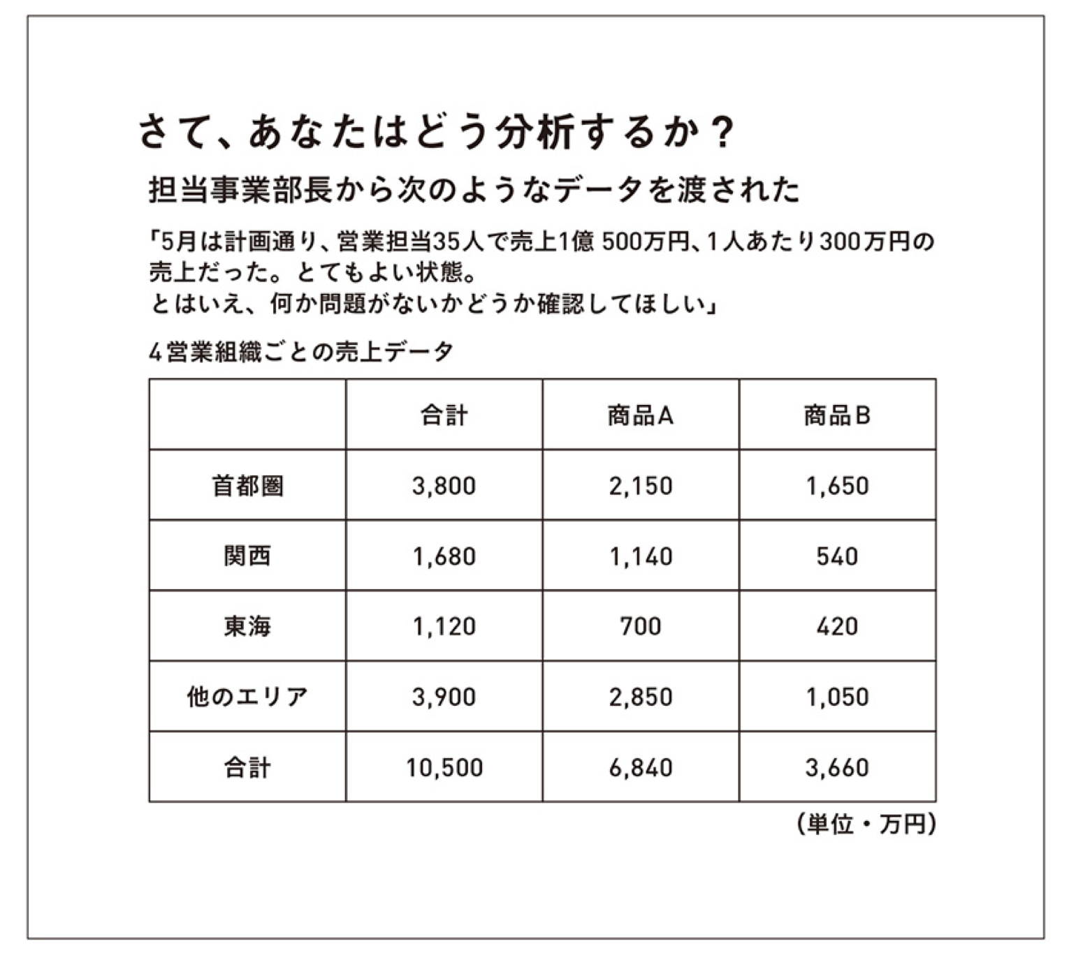 【質問】あなたはある営業部の営業企画担当です。担当事業部長から次のようなデータを渡されました(次の図参照)。