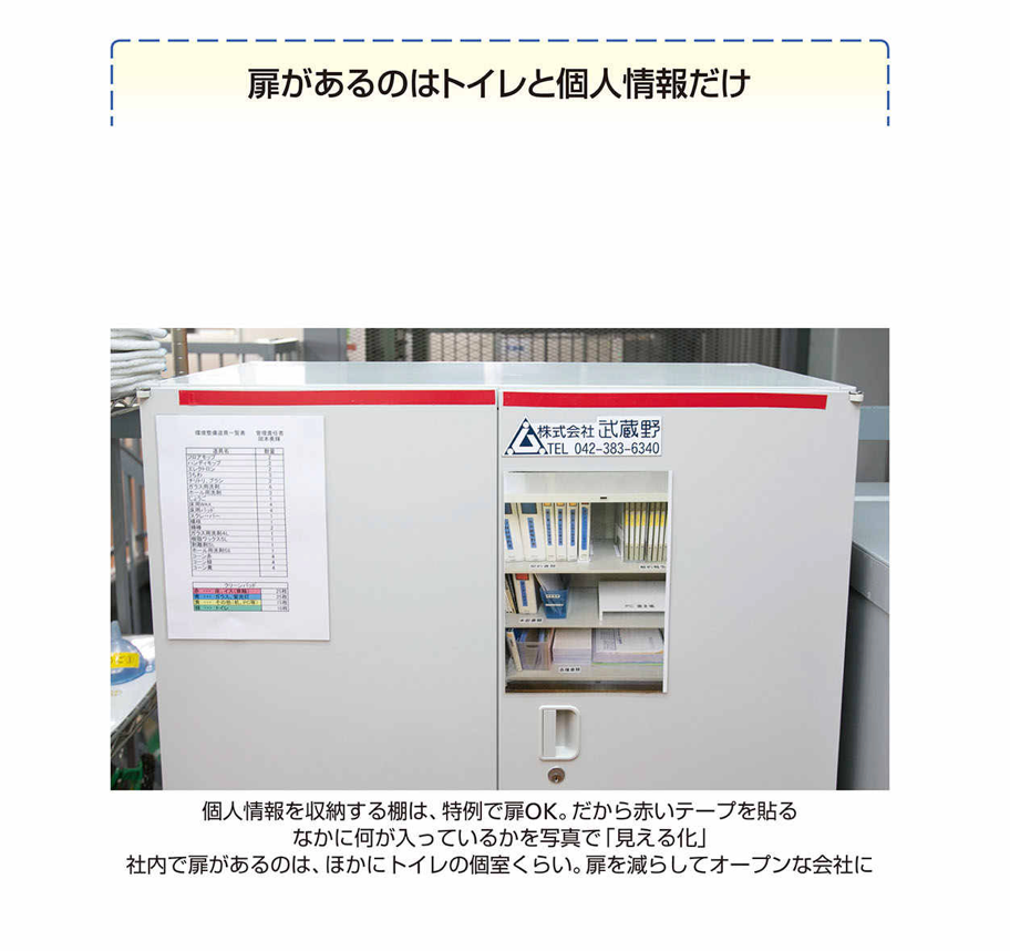 すると社員は渋々ながら、棚を片づけ、整頓するようになりました。私は、社内の扉という扉を、どんどん撤去していきました。