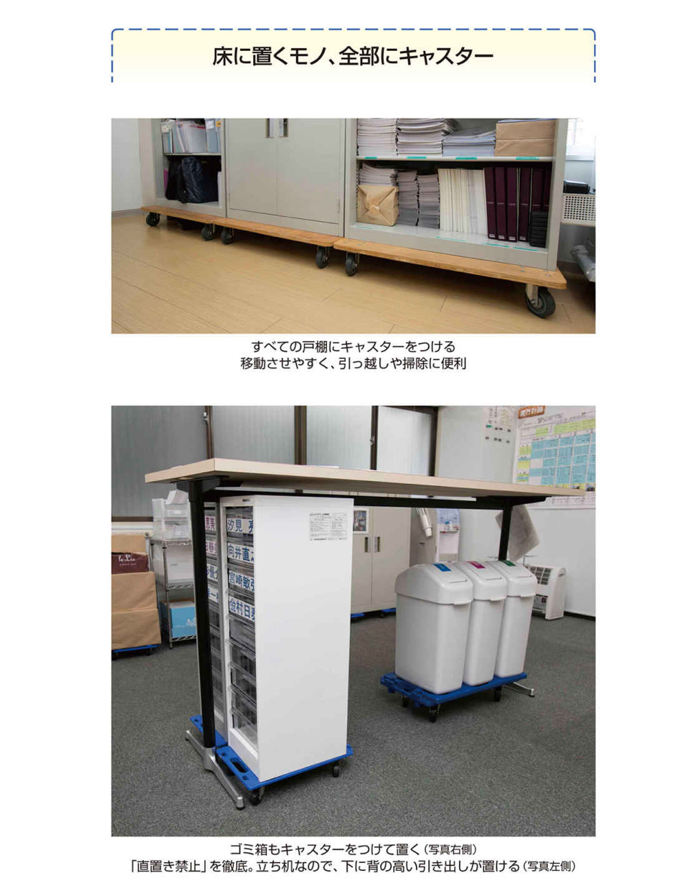 「どうしても直置きしなければならないモノには、すべてキャスターを取りつけなさい。あるいは、キャスターをつけた台の上に置きなさい」