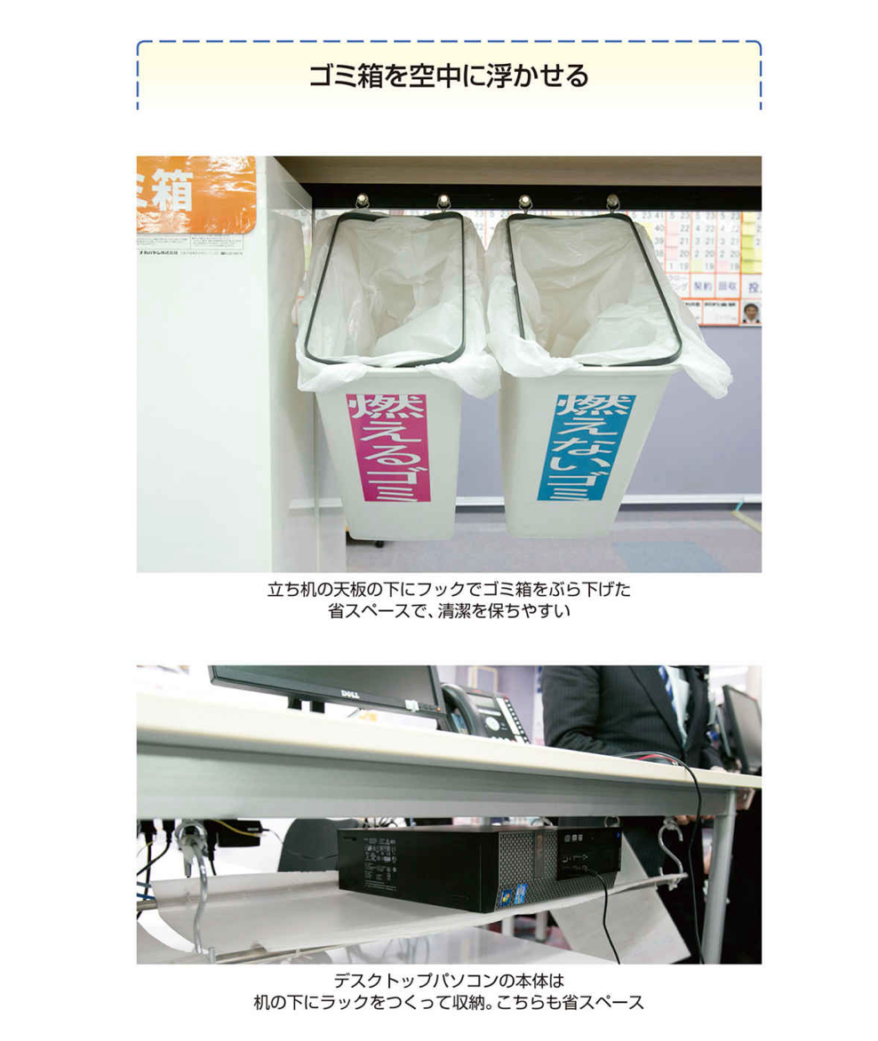 ゴミ箱について、社員は、さらにラクな方法を発明しました。机の天板の下にフックを取りつけて、ゴミ箱を引っかけ、空中に浮かせた(次ページ上)。