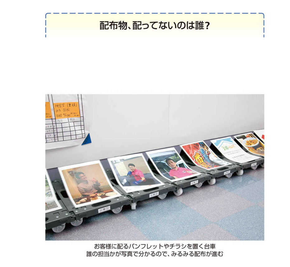 さらに、配布物の上に、担当者を特定できる写真を載せています。こうすれば、誰がサボっていて配布物が多く残っているか、あるいは、誰が一生懸命やっていて配り終えたかが、一目で分かります。
