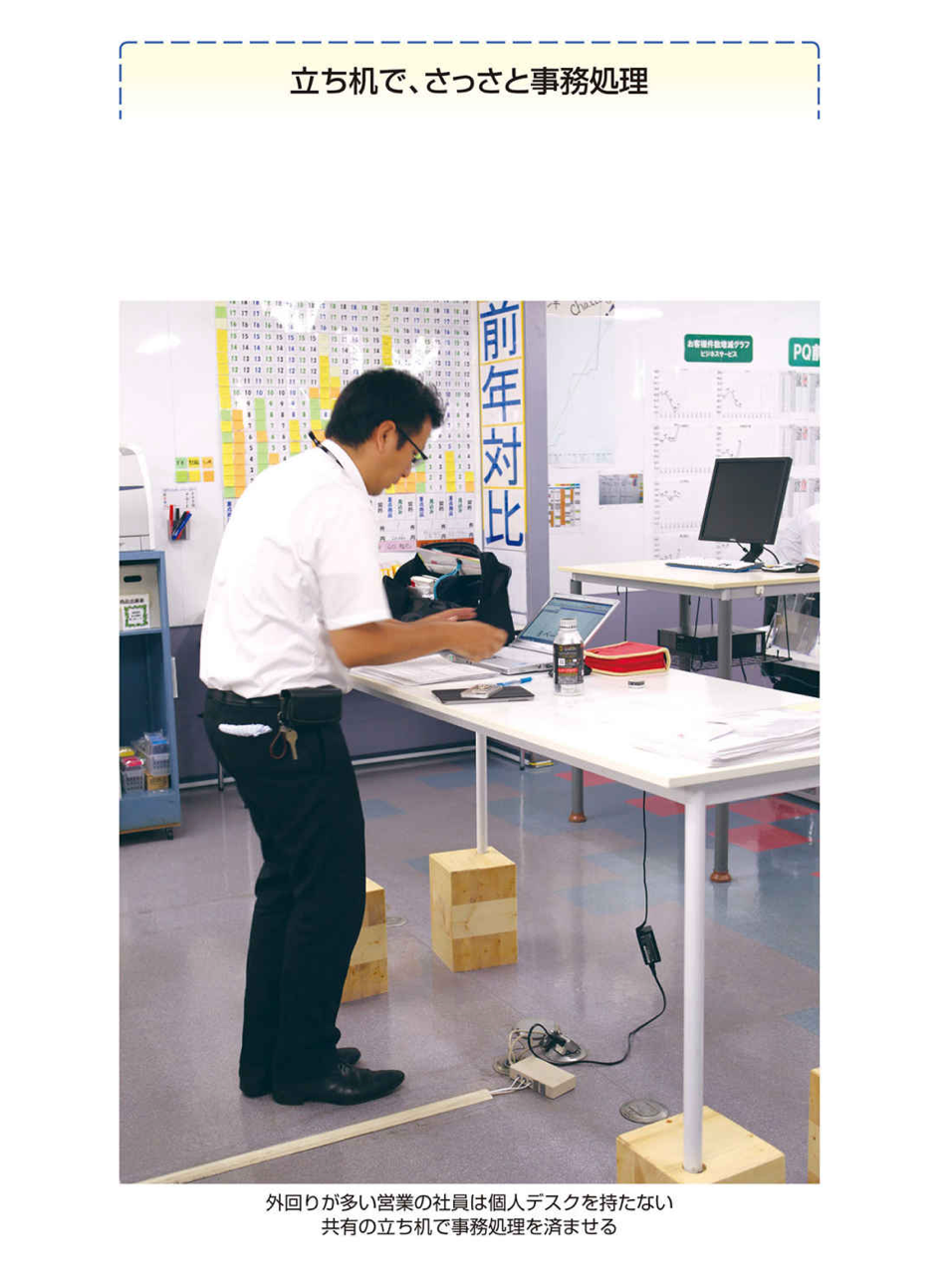 外回りが多い営業の社員は自分のデスクと椅子すら持たず、立ち机で事務処理します(こちらを参照)。