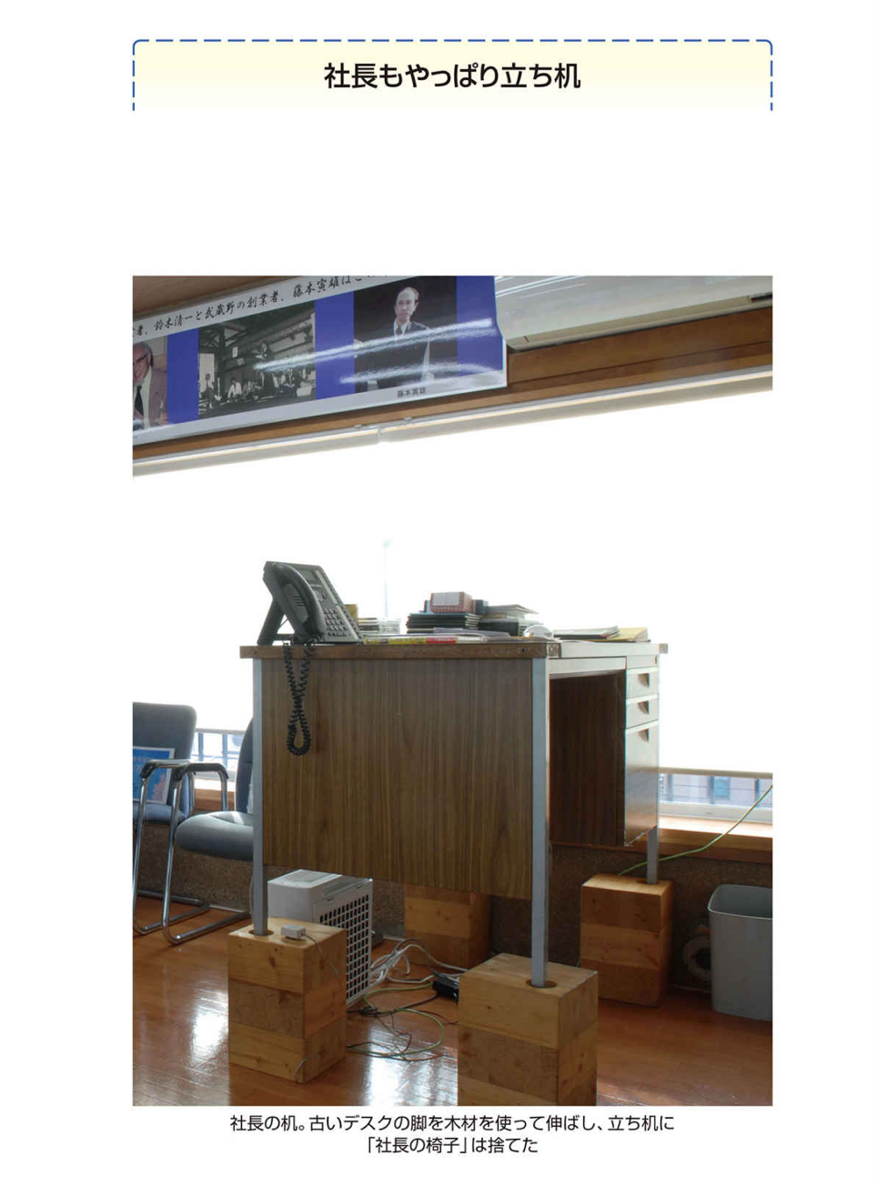 第2に、モノを置く場所を減らす。我が社は、すべてのデスクに引き出しがありません(次ページ上)。社長の机は引き出しがありますが、記念品です(こちらを参照)。
