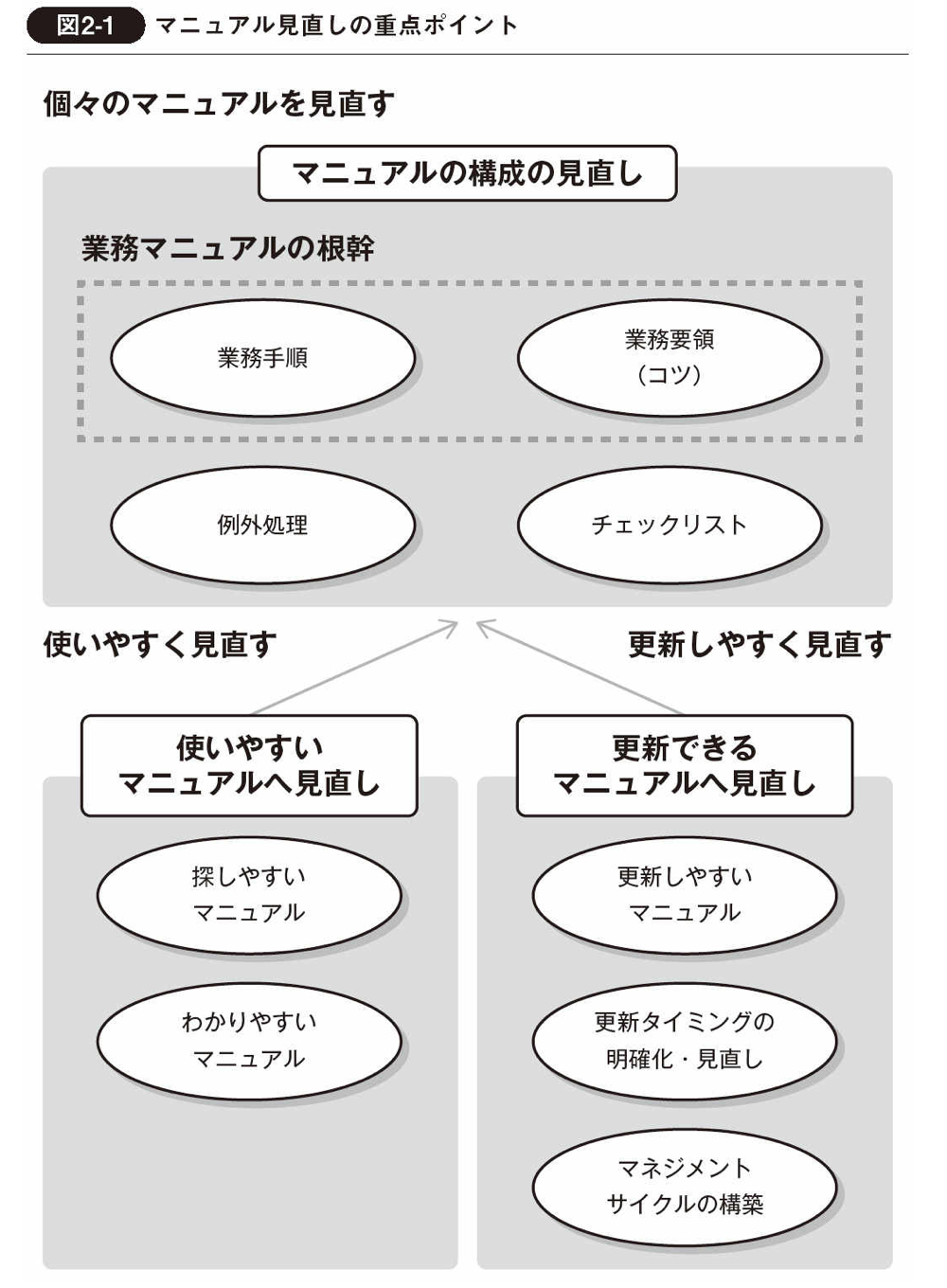 またマニュアルごとにどのような項目が解説されているのかを示す構成表を作成し、どのような業務の解説が、どこに書かれているか、項目の順番はどのようになっているのかなどが一見してわかるようにします。