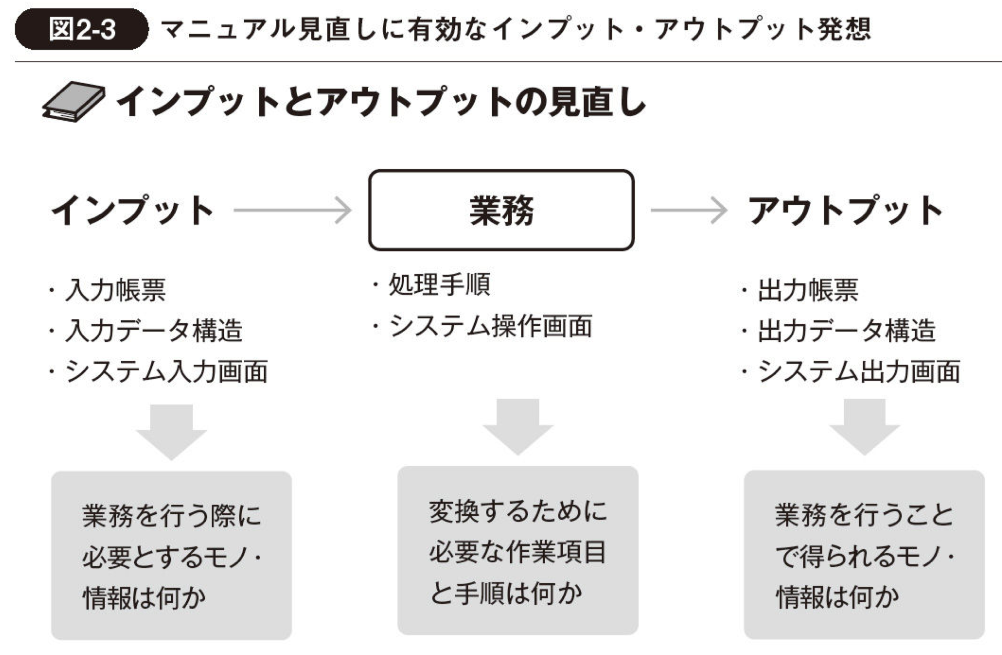 その業務を行うために必要なインプットとは何か、その業務を行うことで何がアウトプットされるのか、具体的な表現で整理します。