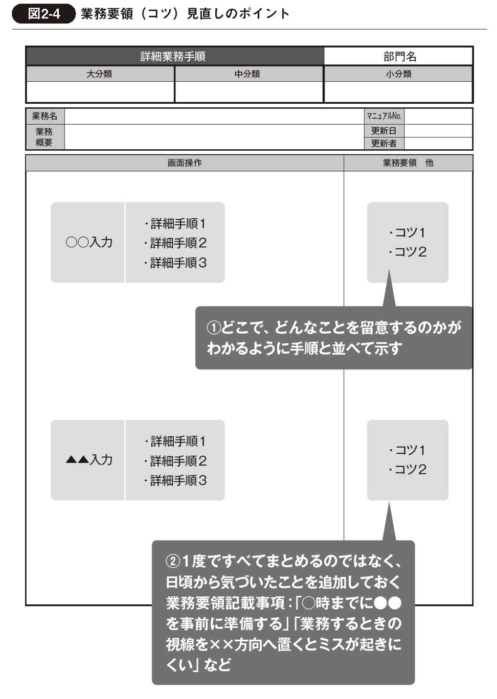 業務手順を見直して、業務の流れが最新状態になっても、よりよい業務遂行はできません。そのためには新たな手順に沿った、業務要領(コツ)を加筆・修正することが必要です。