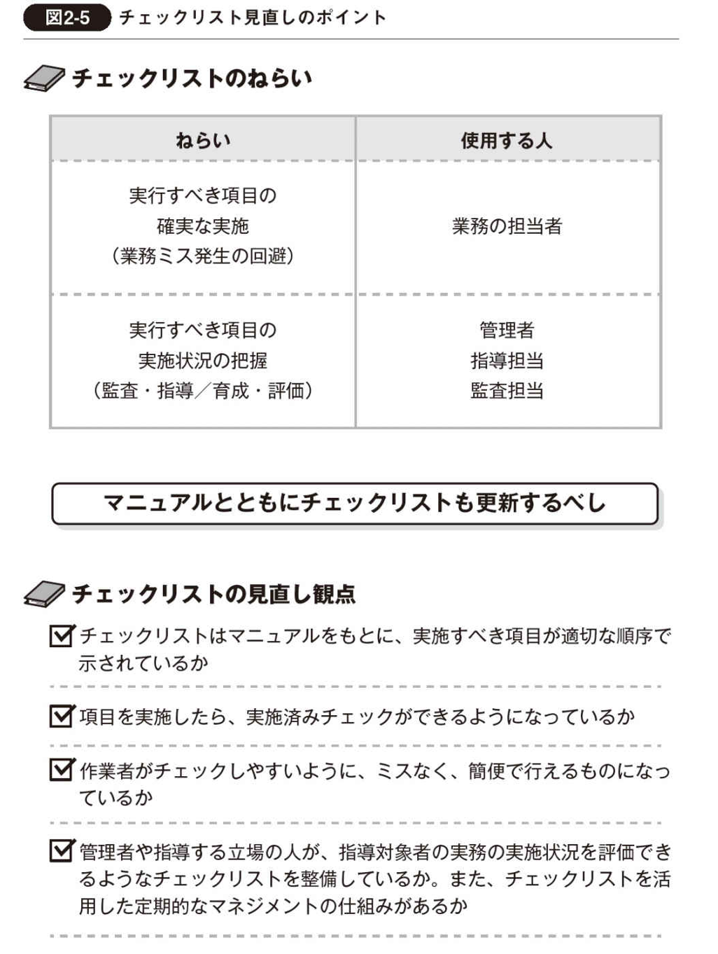 マニュアルに書かれている内容を「徹底させる」ためのツールであり、マニュアルの補完的な位置付けとなります。したがって、マニュアルを改訂すると、チェックリストも改訂しなければなりません。