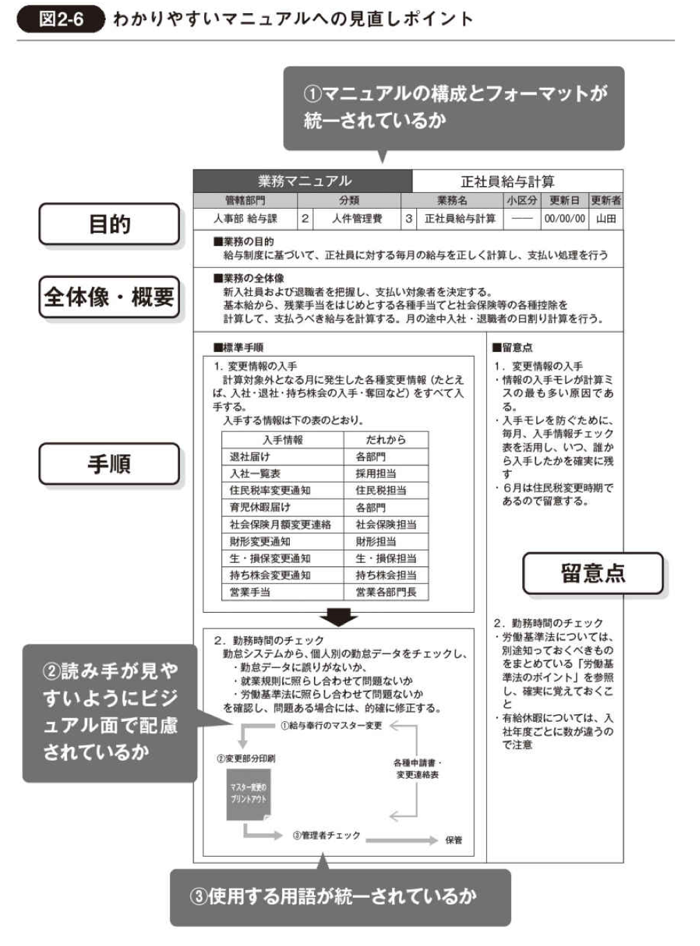前項でも説明したように、業務ごとに解説するものの構成が統一されていなければわかりにくくなるだけでなく、探しにくくなります。