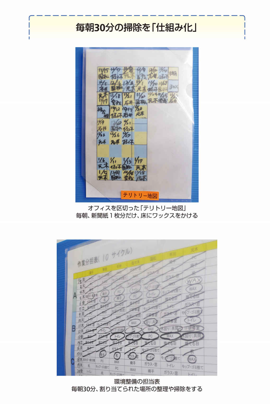 こうやってモチベーションが上がるのも、作業分担表とテリトリー地図で、誰がいつ、どの床を磨いているかを「見える化」しているからです。