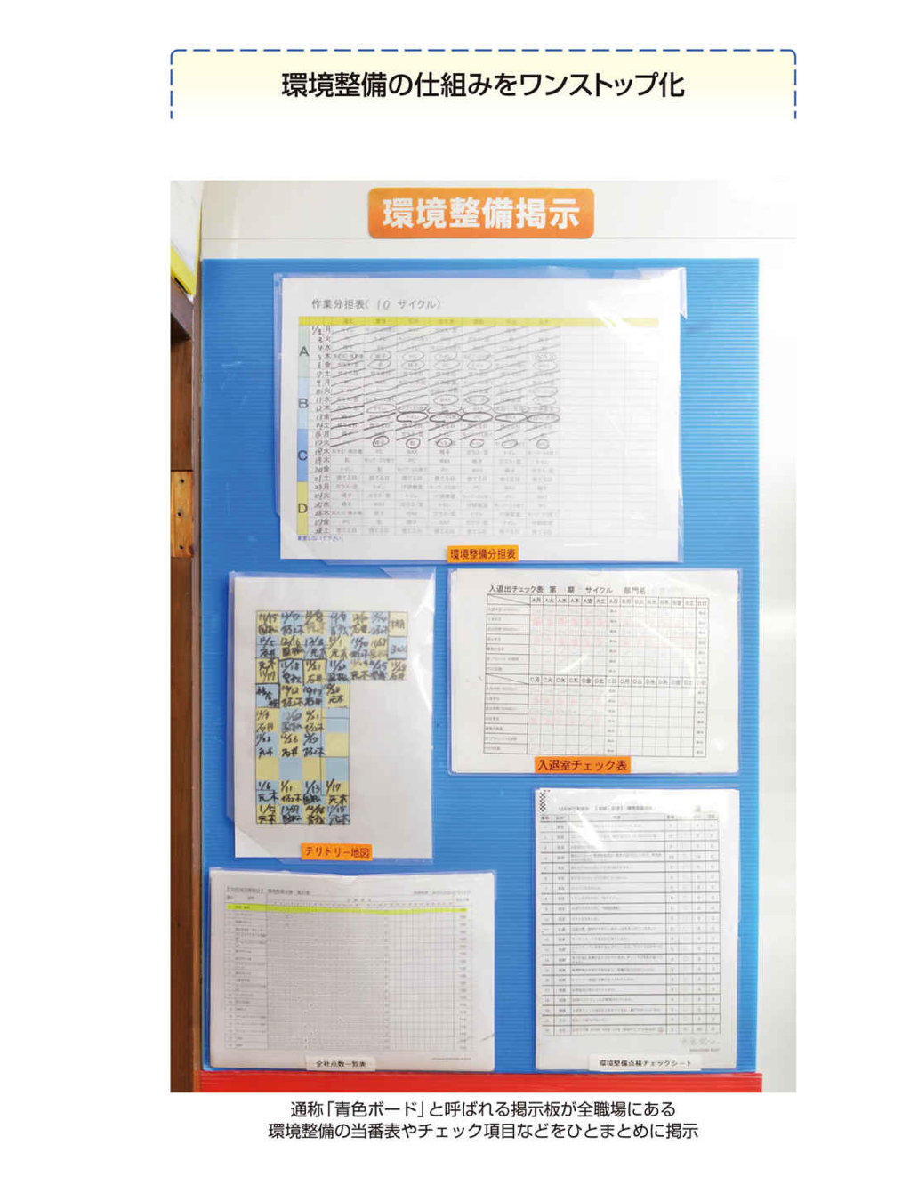 私たちの会社では、全社員が毎朝30分、就業時間を使って環境整備に取り組みます。社員それぞれの作業内容は毎日違って、次ページ下の「作業分担表」にあります。