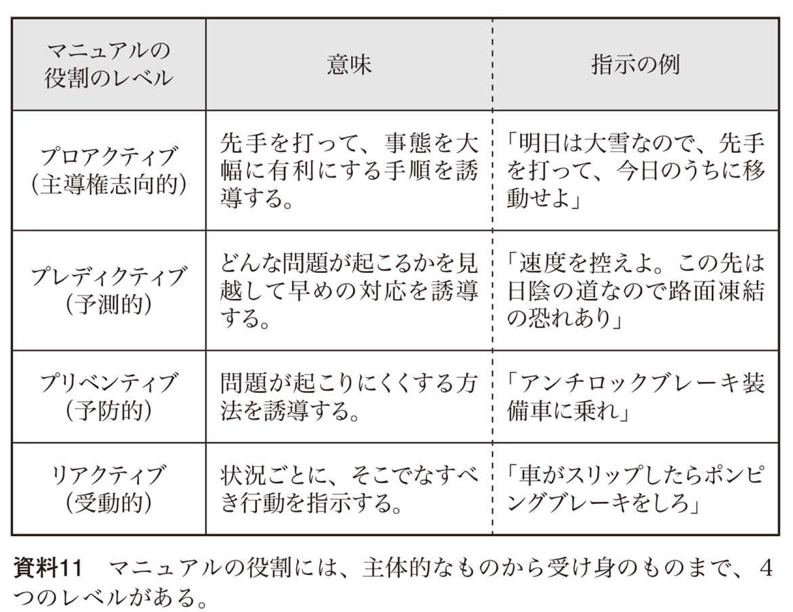 最も素朴なマニュアルは、状況に対して受け身の行動を説明しているが、レベルが上がるに従い、徐々に作業者が先を読むことへの支援を提供し、最終的には状況変革の主導権を握るように仕向ける。
