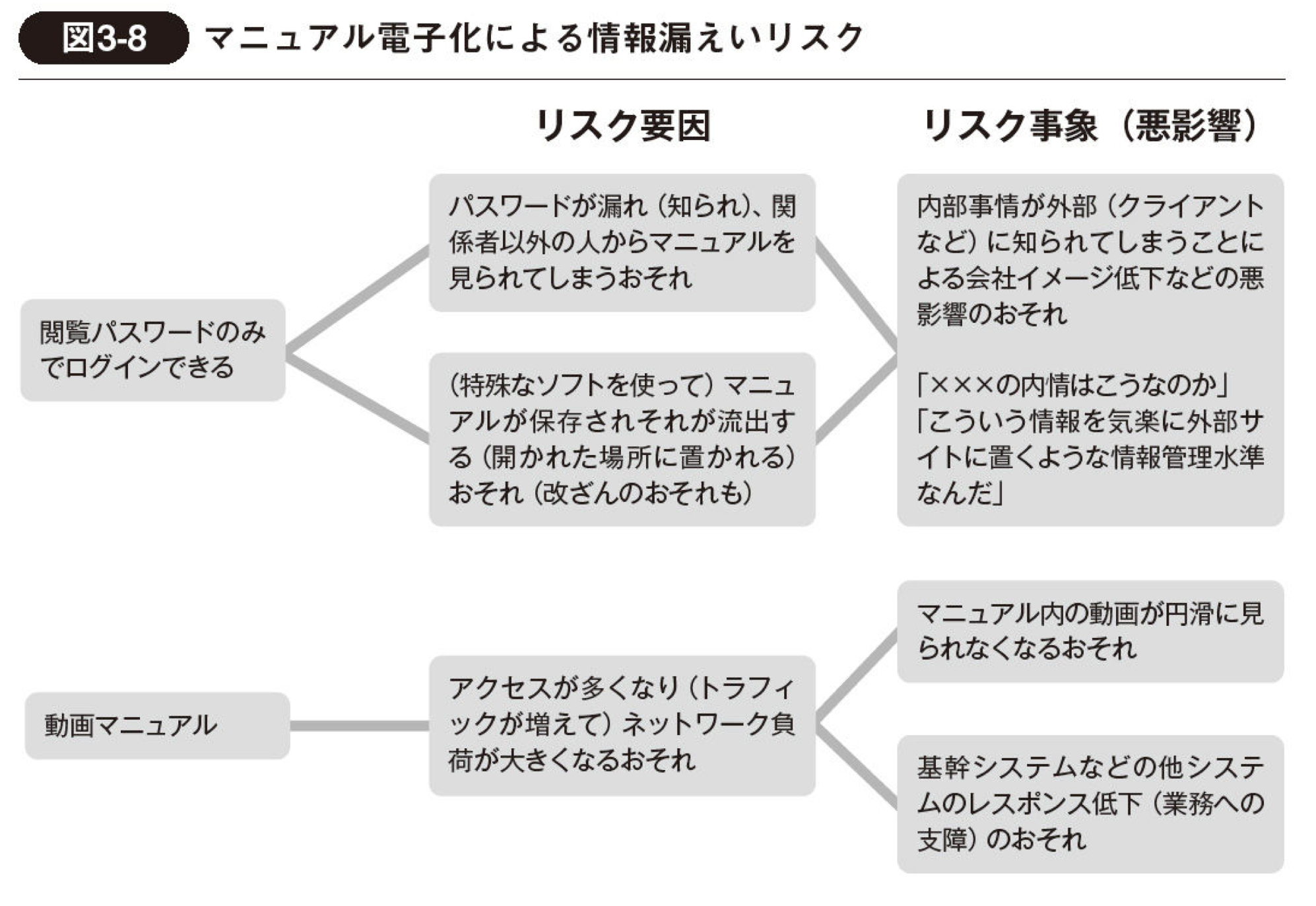 日本ネットワークセキュリティ協会に機密性リスクの分類分けがありますが、それによると業務マニュアルは機密性リスクが中~大のものと扱われ、セキュリティ対策がやはり必要な領域と認識されています。