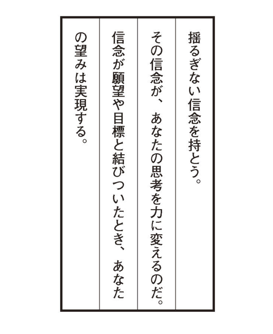 ここで、信念を持つことの素晴らしさを力強く宣言してみよう。心の中で何度も繰り返していただきたい。私は信念を、不滅の信念を持とうとしている。