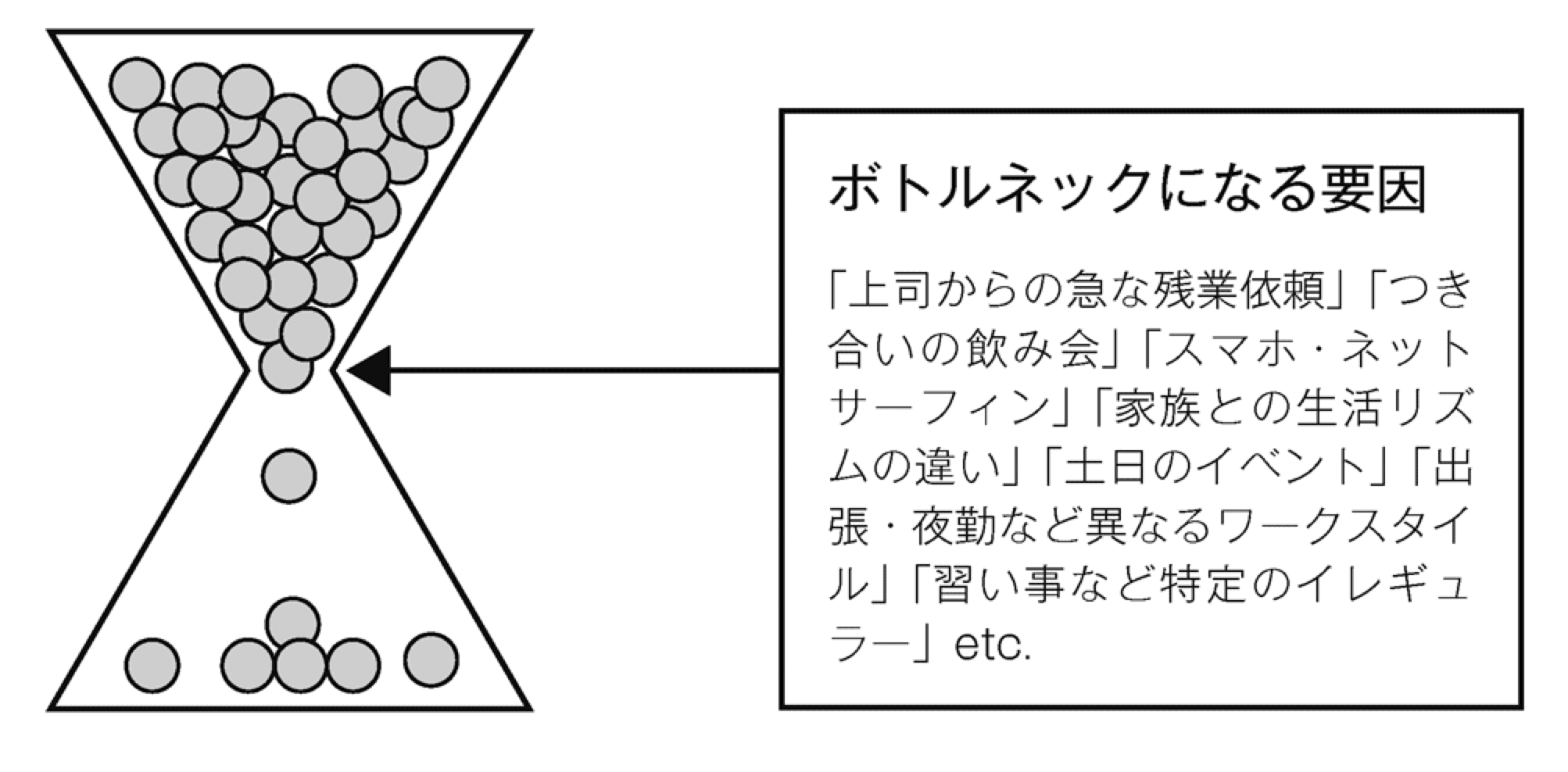 今の生活習慣から朝型の生活習慣に変えるときに、必ず起きてくるのが「ボトルネック」となる事象です。