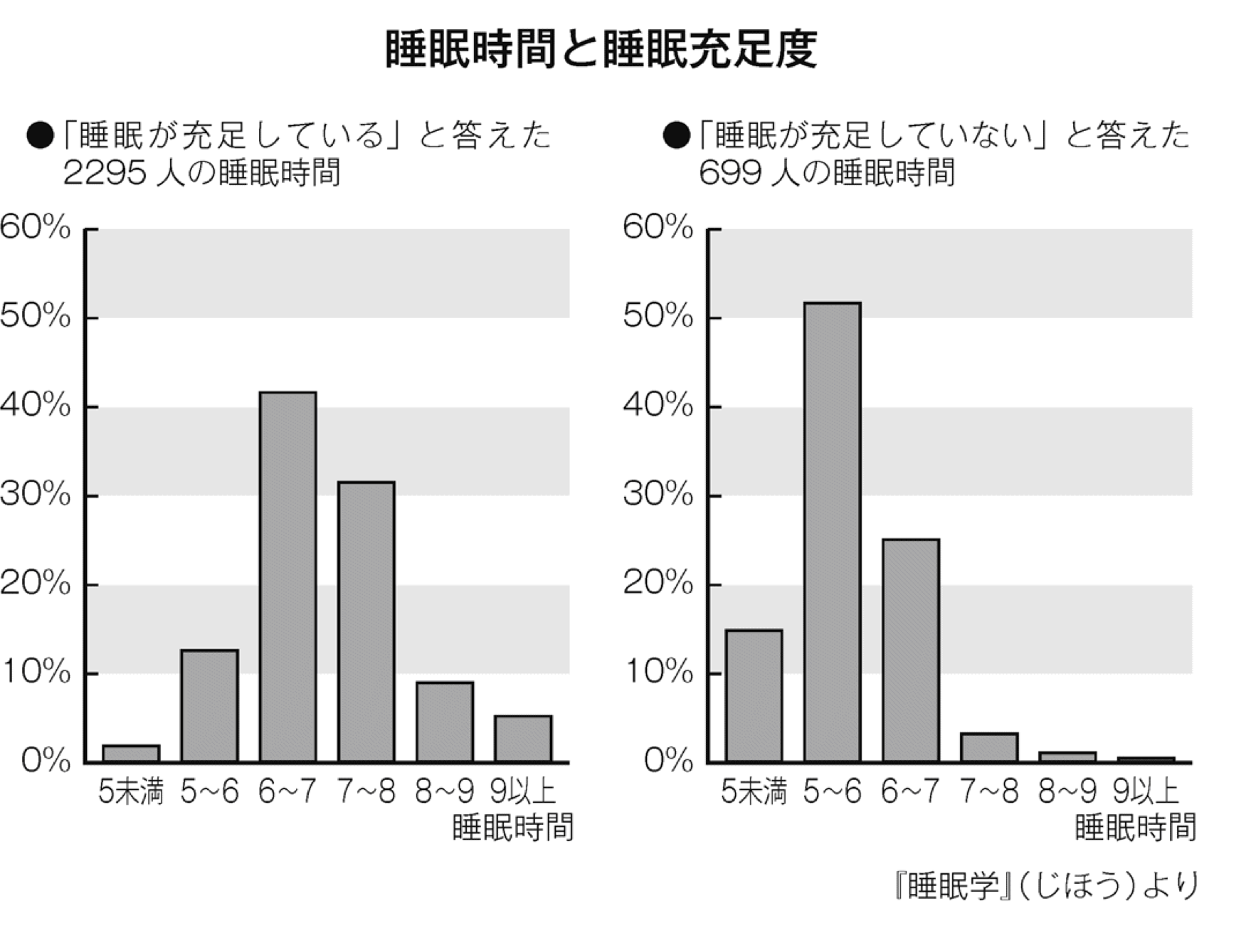 このデータからいえることは、快適な睡眠が取れている人は、睡眠時間が6時間以上、睡眠不足を感じている人は睡眠時間が6時間以下ということです。