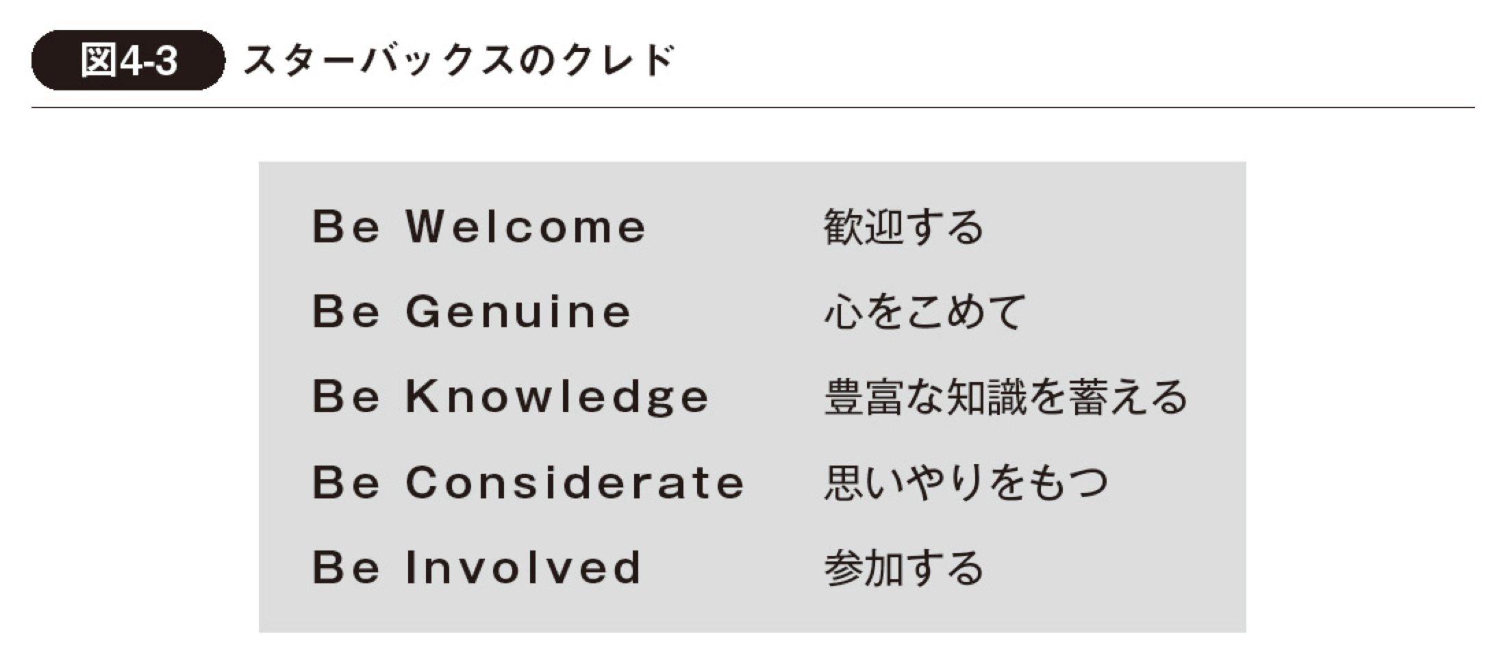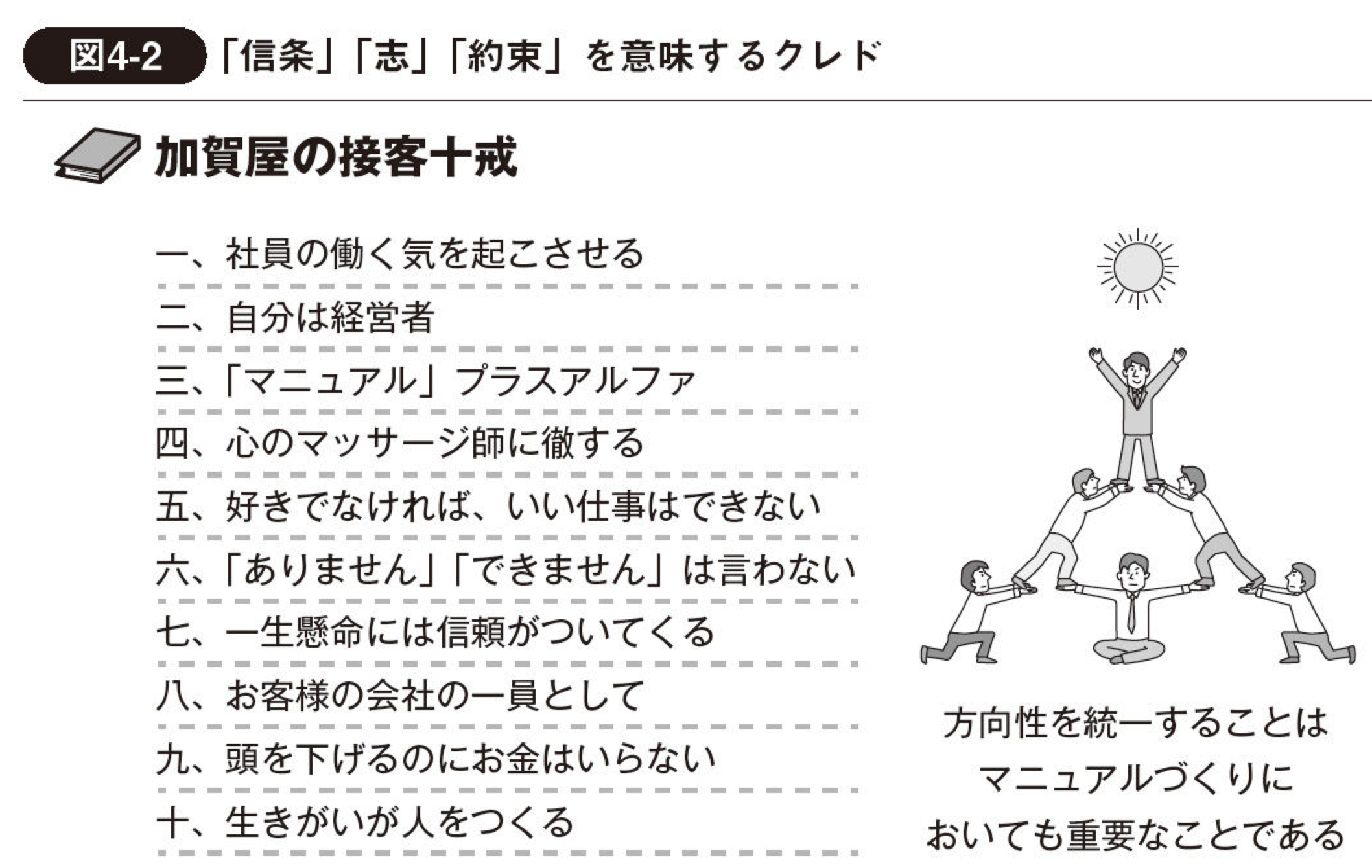「クレド」とは、ストーリー内で紹介したジョンソン・エンド・ジョンソンやザ・リッツ・カールトン、おもてなしで定評のある「加賀屋」などが採用している仕組みで、企業理念に基づいた行動指針を具体的かつ簡潔に記載したものです。