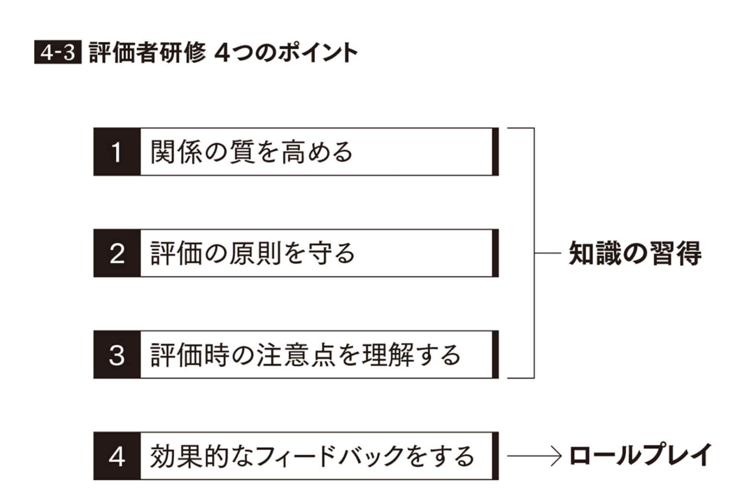 評価者が評価についての教育を受けていないために、適切な評価ができていないという問題を指摘しましたが、その対策として私たちは評価者研修と評価会議を実施することを提唱しています。まず、評価者研修から説明していきましょう。評価者研修では次ページの図43に示した4つのポイントを中心に座学とロールプレイで学んでもらいます。