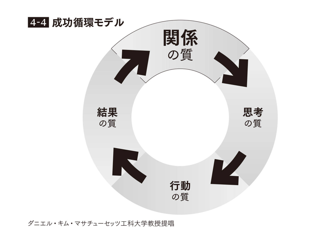 一言で言えば、組織として成功するには、「メンバー間の関係の質を高める」ことから始めるというものです。店長が店のスタッフの話をよく聞くなどして、組織のメンバー間での「関係の質」が高まってくると、個人にもいろいろな気づきが出てきて、「思考の質」が向上します。