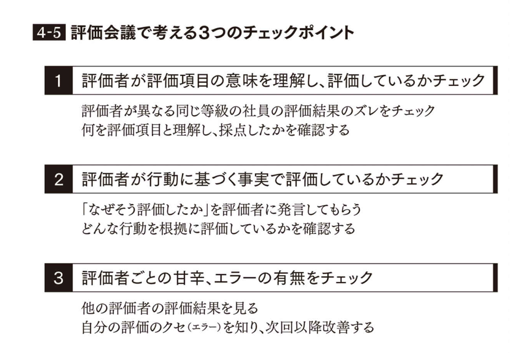 評価会議ではどのような点に気をつければいいのか、チェックポイントを3点に集約して図45に示しました。