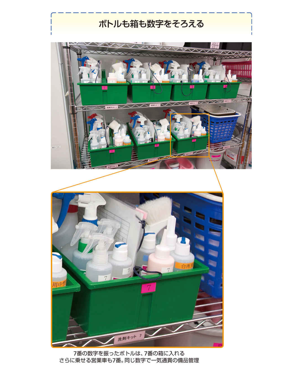 こうして1番のボックスには、必ず1番の洗剤を入れる。さらに1番のボックスは、必ず1番の営業車に載せる。洗剤1本から営業車まで、1番なら1番で一気通貫させて、管理している。