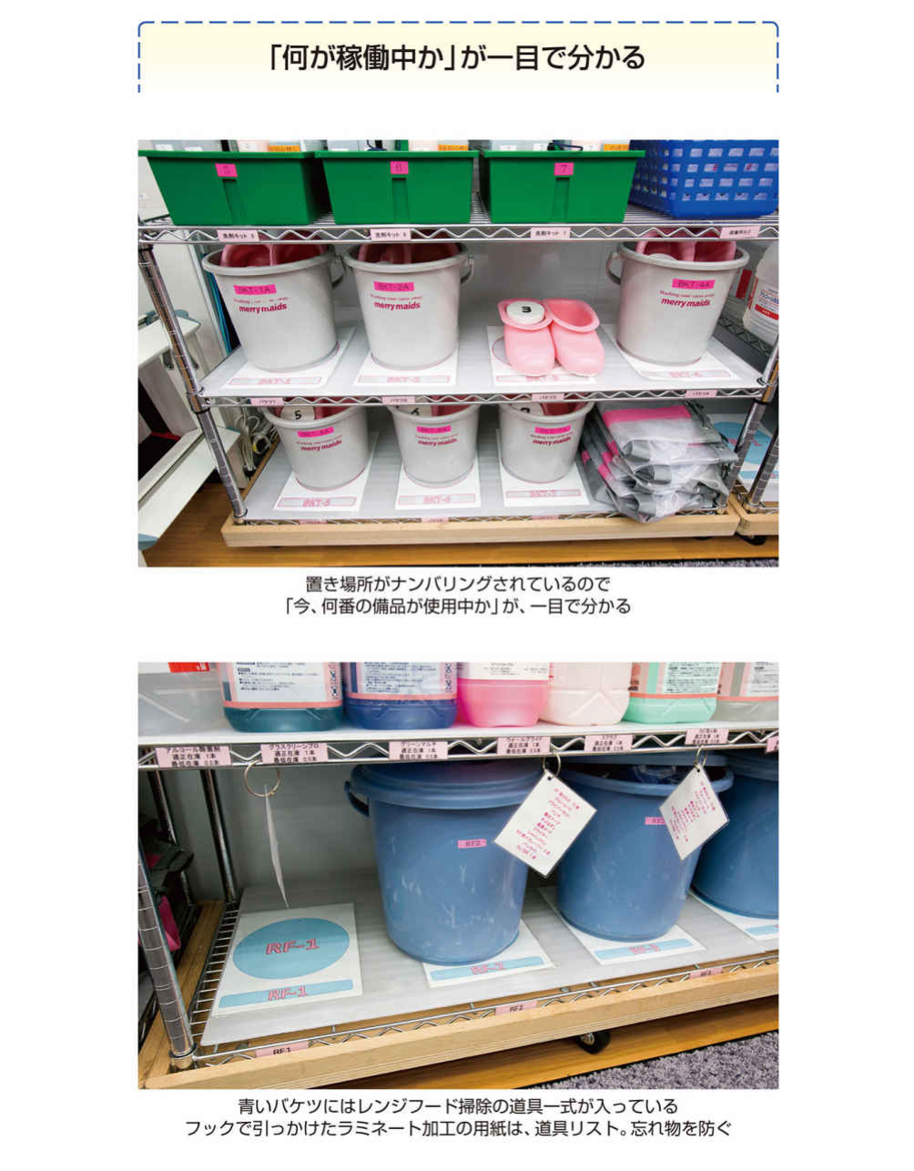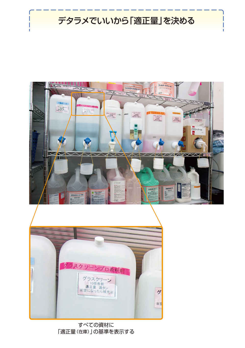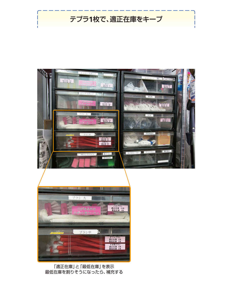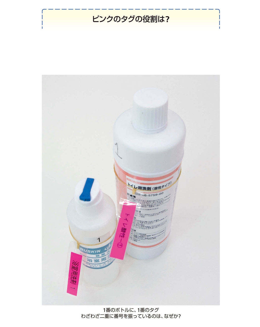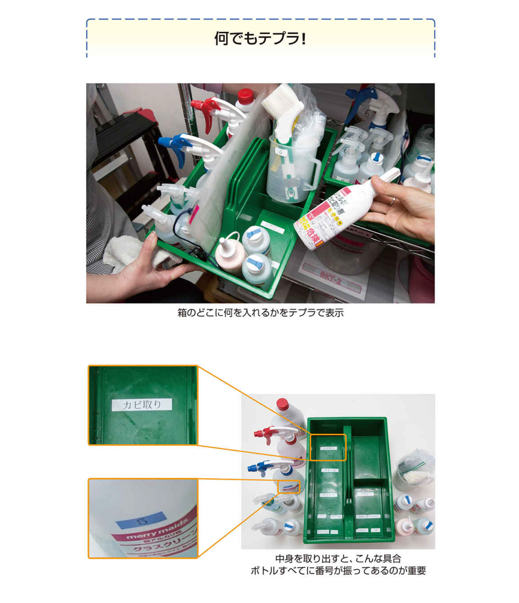 さらに次ページの写真のように、ボックスに入れる洗剤にもすべて番号を振り、ボックスのなかでの置き位置を「テプラ」を貼って、示しています。