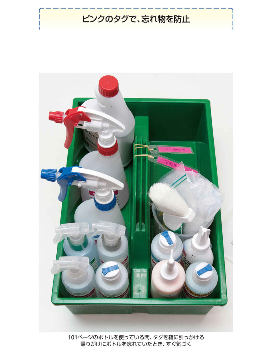 予備の洗剤を使っている間は、タグを外して「必携セット」の箱に、写真のように引っかけておく。すると、帰りがけに「ああ、今日は予備の洗剤を持ってきていたっけ。忘れずに持って帰らなくちゃ」と、気づく。