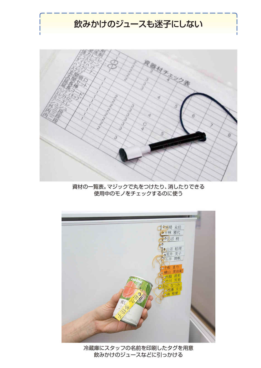 さらに、この部署では、飲みかけのジュースが誰のものか分からなくなるのを防ぐため、個人別のタグをつくり、冷蔵庫に貼っています(前ページ下)。
