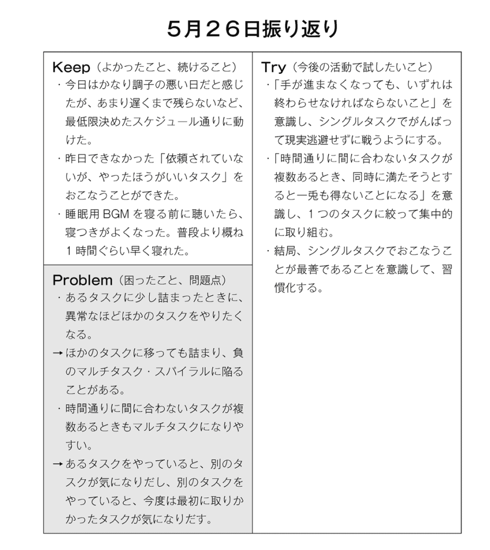 朝の通勤電車や前日の夜に計画を立ててください。しかし、私が計画より強調したいのが、振り返りです。
