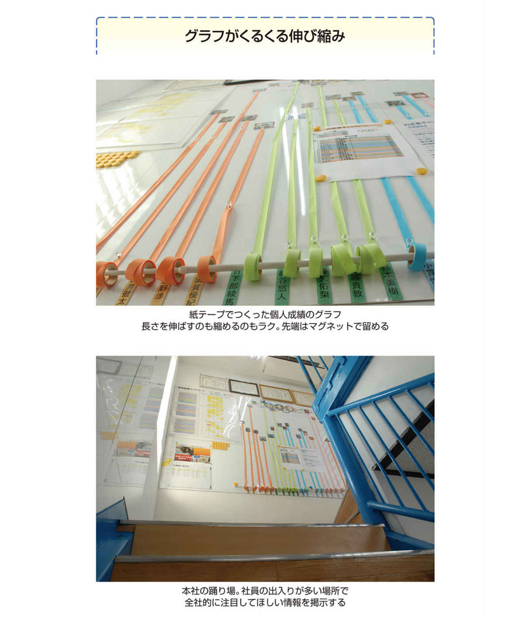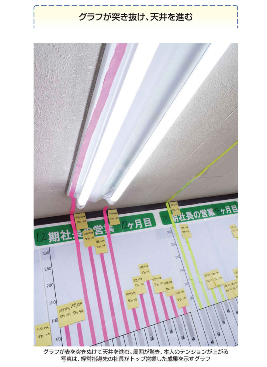 壁一面に掲示されるグラフが突き出るから、驚きとやる気が生まれます。武蔵野のグラフは、天井に達して、天井を進むこともあります(次ページ)。