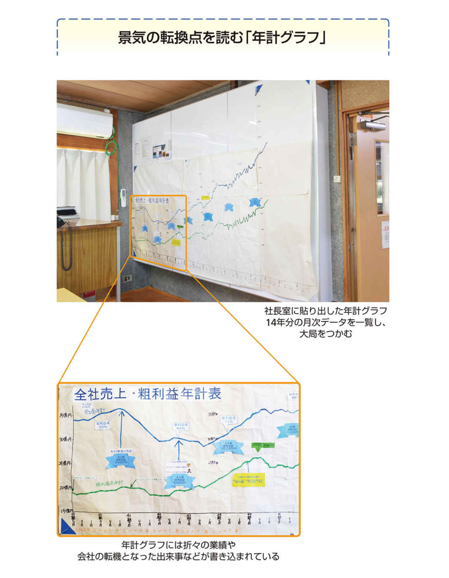 私が見るところ、売り上げ年計グラフを書いている社長は、書いていない社長と比べて、市場における潮目の変化を察知するのが9カ月は早い。