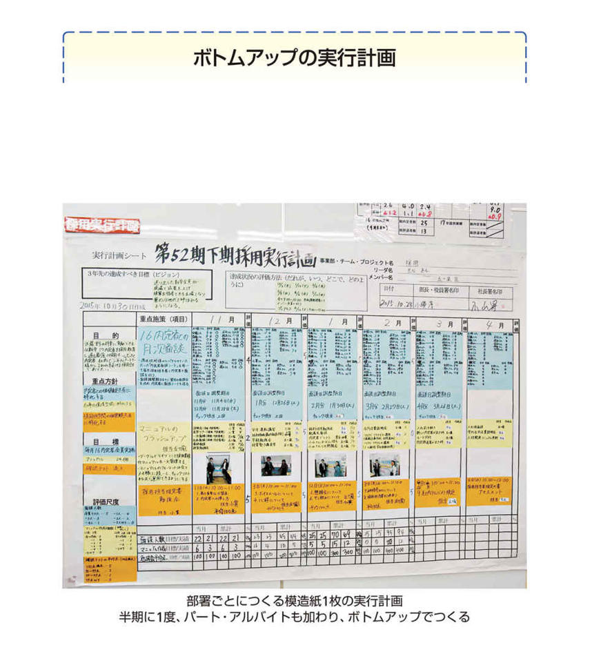 会社の方針は、私と幹部が「経営計画書」を通じて示します。方針に基づく部署ごとの計画は、現場の社員とパート・アルバイトのスタッフが、ボトムアップで完成させます。