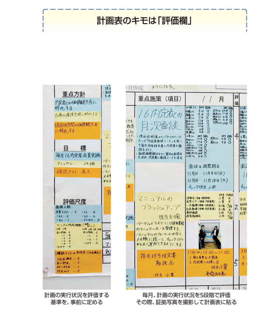 だから、実行計画シートのフォーマットに最初から、評価尺度を設定する欄と、評価結果を記入する欄があります。さらに毎月、メンバーが評価を実行したかを確認するため、証拠写真を貼ります。