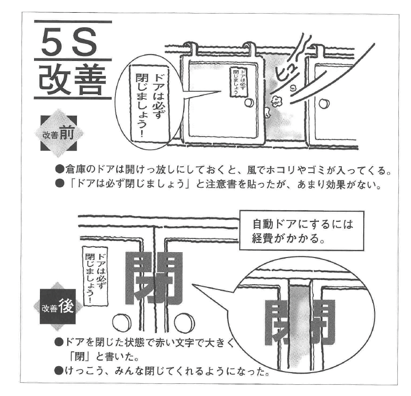 「棚が乱れていたので整頓をした」 「床が汚れていたのでモップで掃除をした」 これらは「5S」であって、「改善」ではありません。