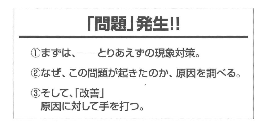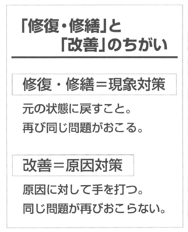 改善とは、① 方法の変更、手段の選択 ② 大きく変えるのではなく、 小さく変えること ③ 現実の制約の中で実施すること 修復・修繕は、「現象対策」です。