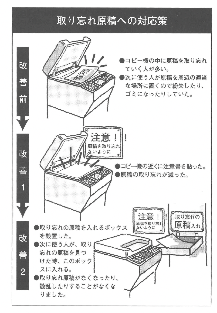 「お金がない」「時間がない」「人 手が足りない」そんな中でも何とか実 施できる方法を考えて実施するのが改 善です。