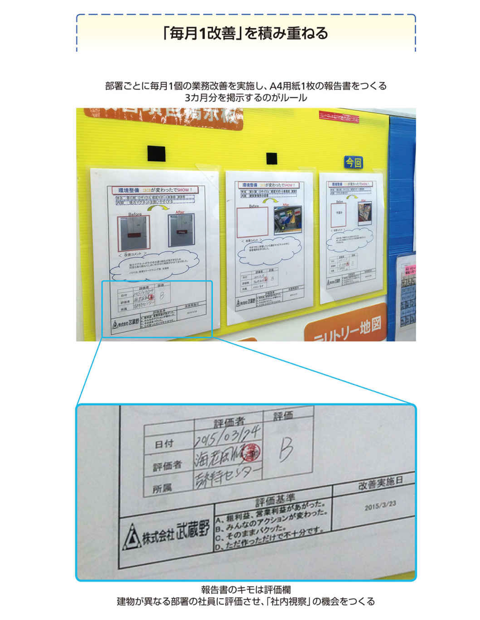 武蔵野は全部署に「黄色ボード」と呼ばれる、次ページの掲示物があります。その部署が最近、実施した業務改善を3つ、A4サイズのシートで説明します。