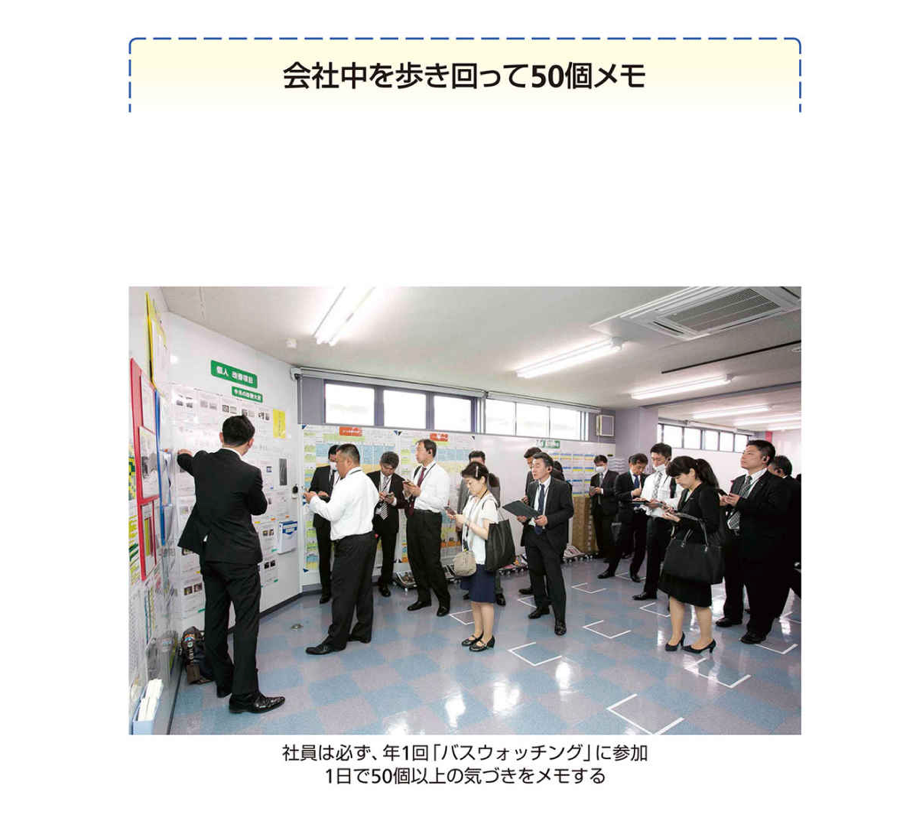さらに重要なのは、何気ない現場の風景に潜む工夫に、自ら気づける力を育むことです。だから、バスウォッチングでは、「今日1日で気づいたこと」を、社員は50個以上、パート・アルバイトは20個以上、書いて提出してもらいます。