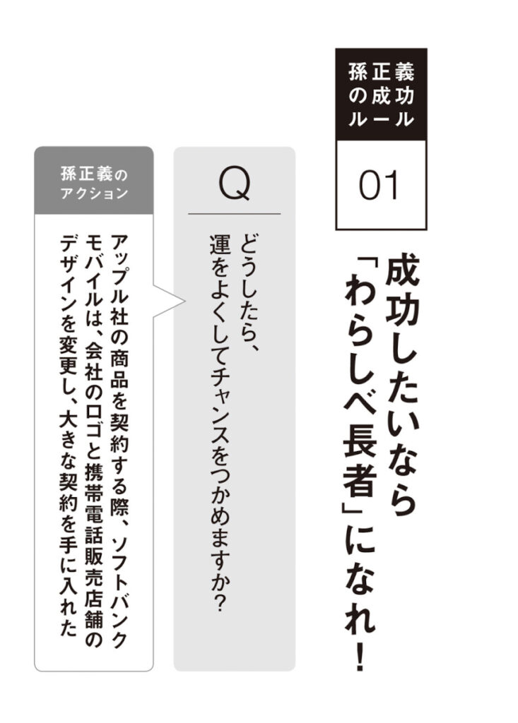 01 成功したいなら「わらしべ長者」になれ! ソフトバンクの「わらしべ長者」のような成功 まわりから声がかかるように常に情報を発信する 孫正義の成功ルール 02 最終目標から逆算して計画をつくる! リスクをとらない生き方では夢は実現しない 50年計画を立ててから、 1日の計画までブレークダウンする 孫正義の成功ルール 03 勝ち癖をつける! 孫正義がいつも自信満々でいられる理由 日本の大企業の沈滞は、組織が自信を喪失したから 部下に自信を取り戻させるための強烈なひと言! 「売る経験」を積ませて営業マンに自信をつけさせる 孫正義の成功ルール 04 大きなチャレンジを細かく変換する! 依頼を受けたら即時に判断をする チャレンジを「当然できること」に変える 孫正義の成功ルール 05 困った時は得意な分野だけに注力する! ネットバブル崩壊の危機から孫正義が脱出した方法 事業の中で成功している要素を見つけて、伸ばす 孫正義の成功ルール 06 行き詰まったら脳をリフレッシュさせる! 日頃会っていない友人から新しい発想やアイデアをもらう 以前の自分自身から元気をもらう 孫正義の成功ルール 07 ゴールを決めた上で必要なことを学ぶ! 孫正義から飛び出した質問 適切な質問で専門家以上の知識を手に入れる まずは登る山を決める 孫正義の成功ルール 08 ロールモデルを決めてやり方を真似る! ロールモデルは職場の先輩でも有名人でも憧れの人でもいい 孫正義のロールモデルは日本マクドナルド創業者 孫正義の成功ルール 09 自ら掲げた「理念」のために働き続ける! アメリカと日本では労働観が異なる 日本的な要素が強い孫正義の経営 「社会の発展のため」が長寿企業をつくる