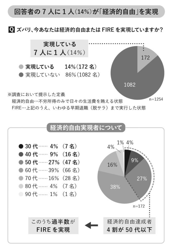 その結果、回答者の 14%、実に 7人に 1人が経済的自由を実現していることがわかりました。