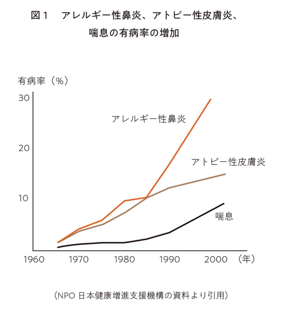 アトピー性皮膚炎と喘息も合わせると、 2人に一人はアレルギーを持っているのです。日本健康増進支援機構の調査でも 1970年代以前は、アレルギーを持つ人はほとんどいませんでした。