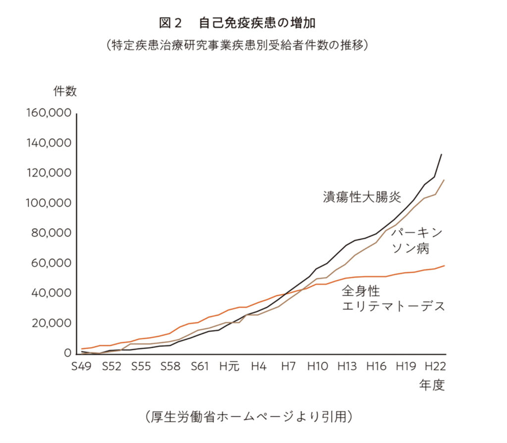 関節リウマチなど、自分の免疫が自分の体のいろいろな臓器を攻撃する自己免疫疾患も花粉症と同じように 1970年代から急増しています。