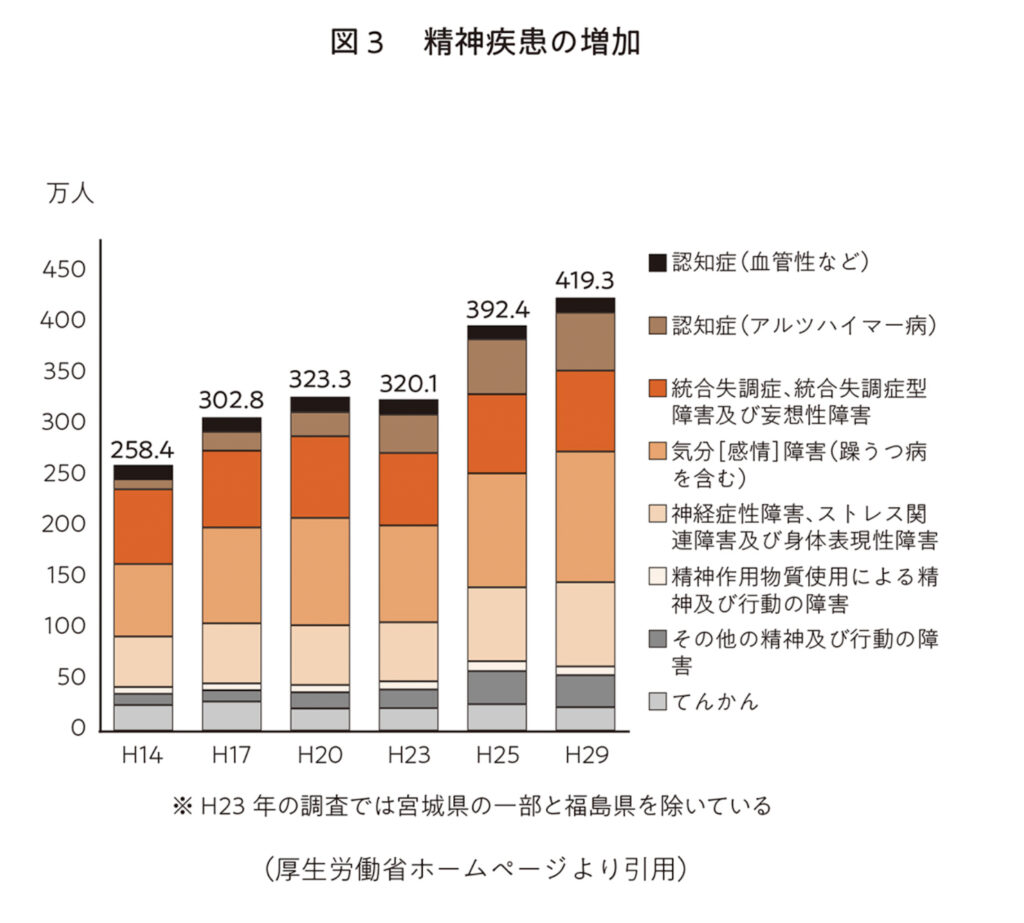 精神疾患も急激に増えています。患者数は毎年約 30万人ずつ増え、 400万人を超えています。