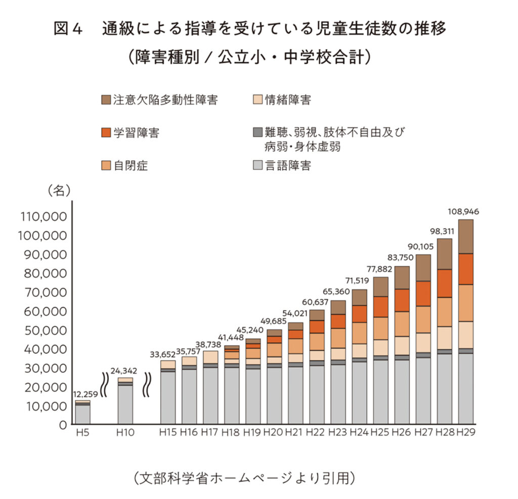 文部科学省は「通級による指導を受けている児童生徒数の推移」というデータを報告しています。
