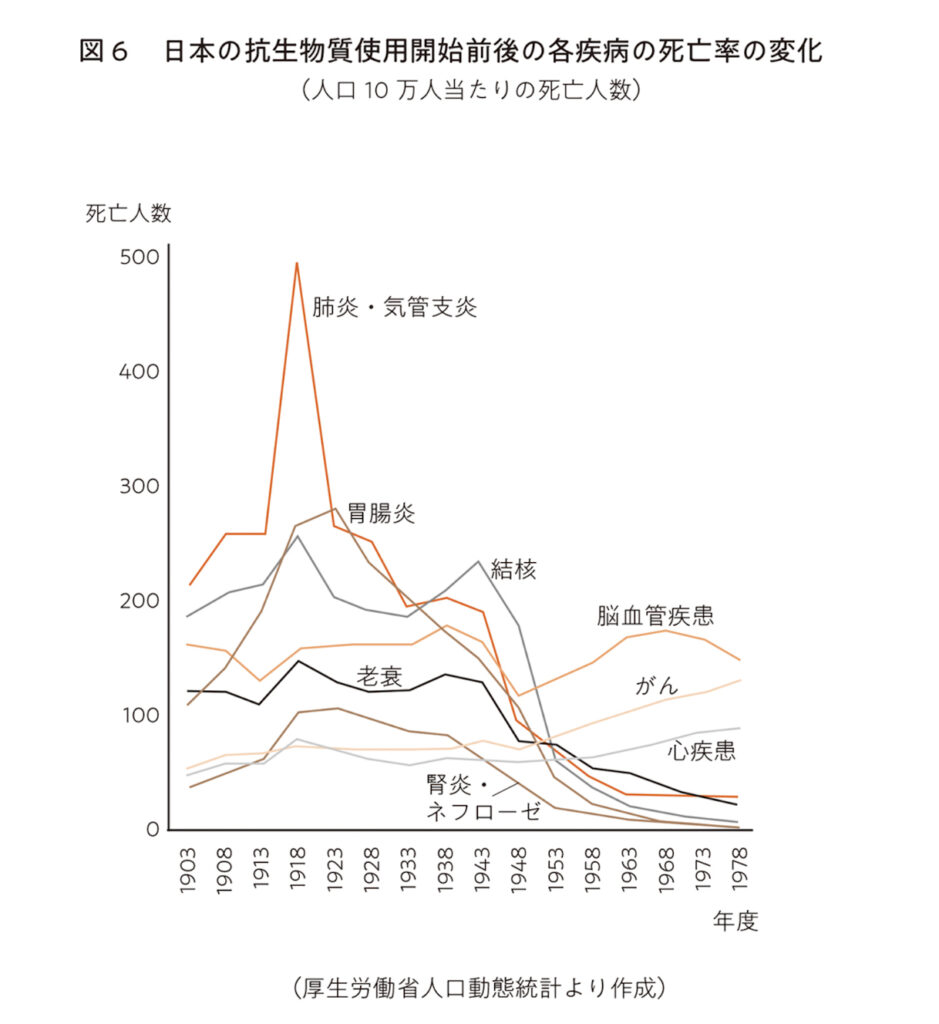 これより以前には、肺炎・気管支炎、胃腸炎、結核、腎炎・ネフローゼで死亡する人が多かったのですが、これらは細菌感染症です。
